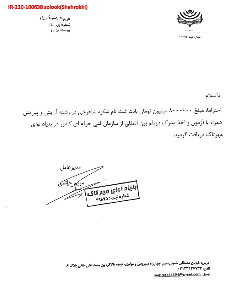 خانم شکوه شاهرخی دوپسرهشت ساله دارد همسرش کم درآمد است وآ نها درجنوب تهران زندگی می کنند ومستاجرند با کمک مالی شما نیکوکاران او دررشته ارایش وپیرایش ثبت نام کرد که این دوره شامل امتحان درمرکز فنی حرفه ای واخذ مدرک دیپلم بین المللی به شرط اشتغال به کار است