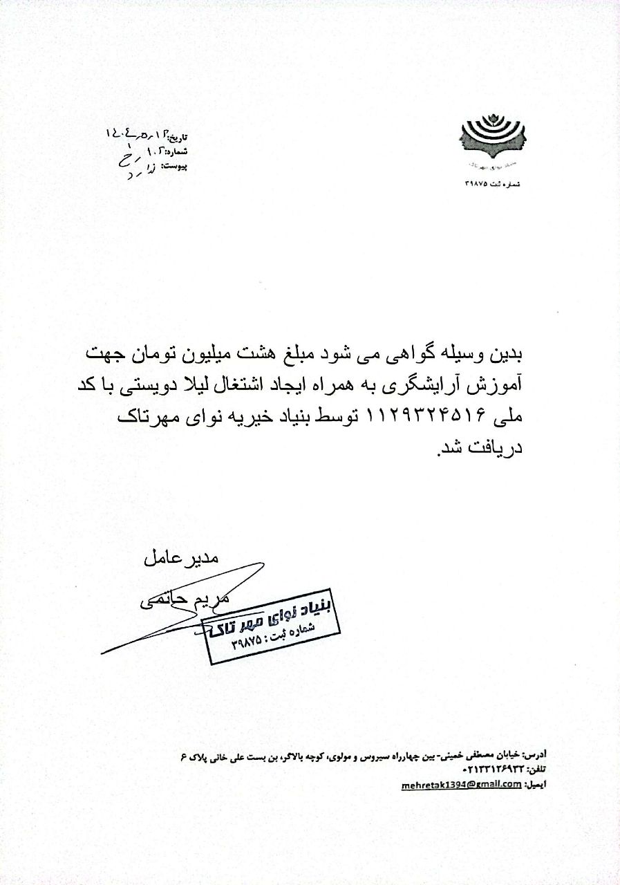 خانم لیلا دویستی سرپرست خانواده است .یک دخترشانزده ساله دارد که کلاس دهم است ویک پسربیست ساله دارد که ترک تحصیل کرده است .آنها درتهران زندگی می کنند ومستاجرند با کمک مالی شما نیکوکاران اودررشته ارایش وپیرایش ثبت نام کردکه این دوره شامل امتحان در مرکزفنی حرفه ای واخذ مدرک دیپلم بین المللی به شرط اشتغال به کار است