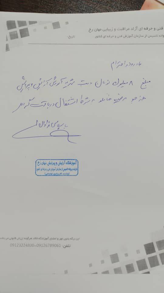 خانم مرضیه خانلو دو پسر دارد یکی یکساله ودیگزری کلاس اول دبستان است همسرش کارگر است وآ نها درشهریار زندگی می کنند ومستاجرند با کمک مالی شما نیکوکاران او دررشته ارایش وپیرایش ثبت نام کرد که این دوره شامل امتحان درمرکز فنی حرفه ای واخذ مدرک دیپلم بین المللی به شرط اشتغال به کار است