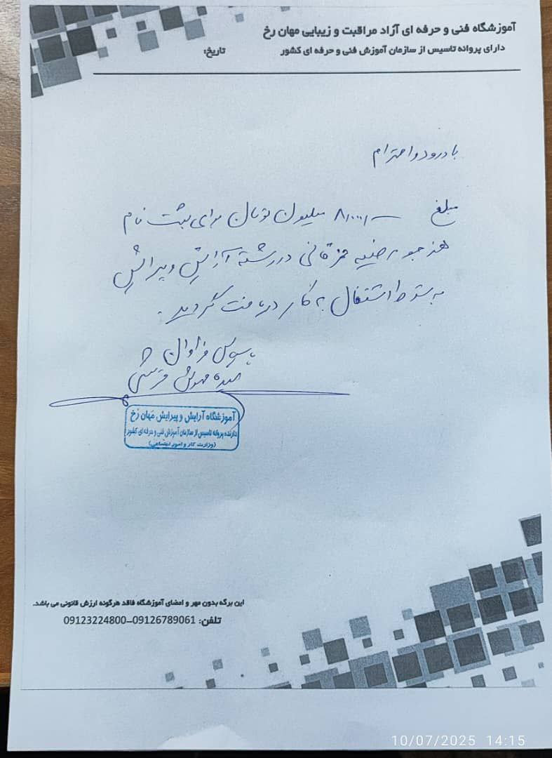 .آنها درشهریارزندگی می کنند ومستاجرند با کمک مالی شما نیکوکاران او دررشته ارایش وپیرایش ثبت نام کرد که این دوره شامل امتحان در مرکزفنی حرفه ای واخذ مدرک دیپلم بین المللی به شرط اشتغال به کار است